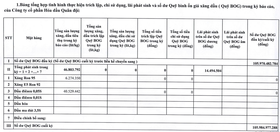 Báo cáo tình hình trích lập và sử dụng quỹ bình ổn giá xăng dầu của Công ty Cổ phần Hóa dầu Quân đội: